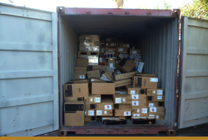 Cargo was stolen or hijacked. Loss can happen during inland transportation, at sea or at the port. Often, container doors are manipulated to steal cargo.